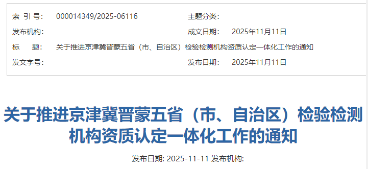 关于推进京津冀晋蒙五省(市、自治区)检验检测机构资质认定一体化工作的通知京津冀晋蒙五省(市、自治区)各级市场监管局,各相关检验检测机构: