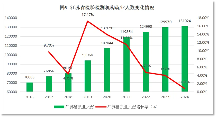 由图7可见,2017-2018年,江苏省检验检测机构从业人数增长率与全国检验检测从业人数变化的曲线十分接近,在这之后江苏省检验检测机构就业人数出现一个较大的增长高峰,此后逐步下降,变化趋势与全国检验检测机构就业人数的变化趋势比较相似,只不过江苏省总体保持了相对高一些的增长率,到2024年度仍然还保持在正增长区间。
