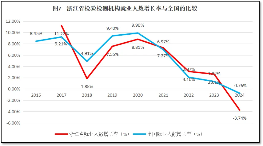 过去9年浙江省检验检测行业就业人口的变化情况如图6所示。由图6可见,从2016年到2023年,浙江省检验检测机就业人口数量从5.7万多人增长到8.6万多人,年均增速6.06%,每年均有一定数量的增长。但2024年出现了就业人口数量的下降,人数为82916人,较2023年净减少了约3000人,这也是浙江省检验检测行业就业人数首次出现下降的情况。从就业人口同比增长率来看,2018年,浙江省检验检测机构就业人口数量增长率曾出现一个低谷,之后几年有所回升。从2021年起又开始下降,2024年度的同比增幅跌到负值,仅有-3.74%,是历年来的最低值。