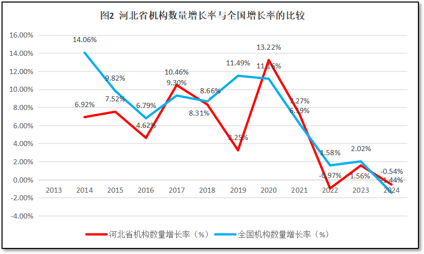 由图2可见,河北省检验检测机构数量的增长率变化趋势与全国的情况总体相似,主要区别在于2019年河北省出现一次比较大的机构数量增长率下降,而全国的曲线在这两年相对平稳。2022年河北省检验检测机构数量增长率的降幅较大,但2023年出现轻微反弹,2024年又有下降,这三年河北省的变化与全国的情况类似。