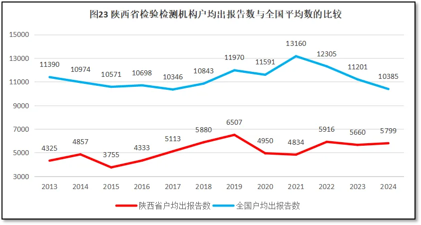 2024年度,陕西省检验检测机构户均出具检验检测报告5799份,是全国平均水平10385份的55.8%,全国排名第23位,处于靠后水平。不过排名比2023年度提升了2个位次。从2013年以来,陕西省检验检测机构户均出具检验检测报告数量与全国的比较,如图23所示。