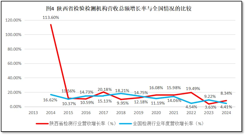 由图3可见,12年来,陕西省检验检测机构营收总额总体保持增长,2024年末陕西省检验检测行业年度营收总额达到128.06亿元,是2013年的7.06倍,增幅很大。从增长率曲线来看,除了头两年因统计数据质量不高导致曲线波动巨大之外,从2015-2022年陕西省检验检测机构营收总额的增幅总体稳定,年均增长14.5%。不过2023年增长率有所下降,仅有3.63%,是近十年来增幅最少的年份。2024年增长率有所反弹,为8.34%。