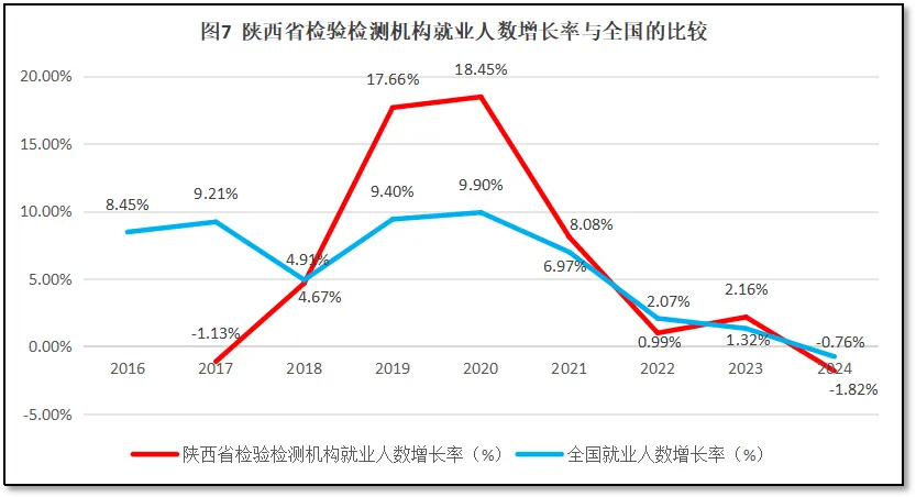 陕西省检验检测机构就业人数增长率与全国检验检测机构就业人数增长率的比较,如图7所示。